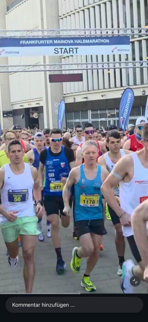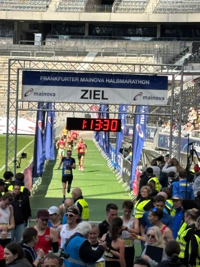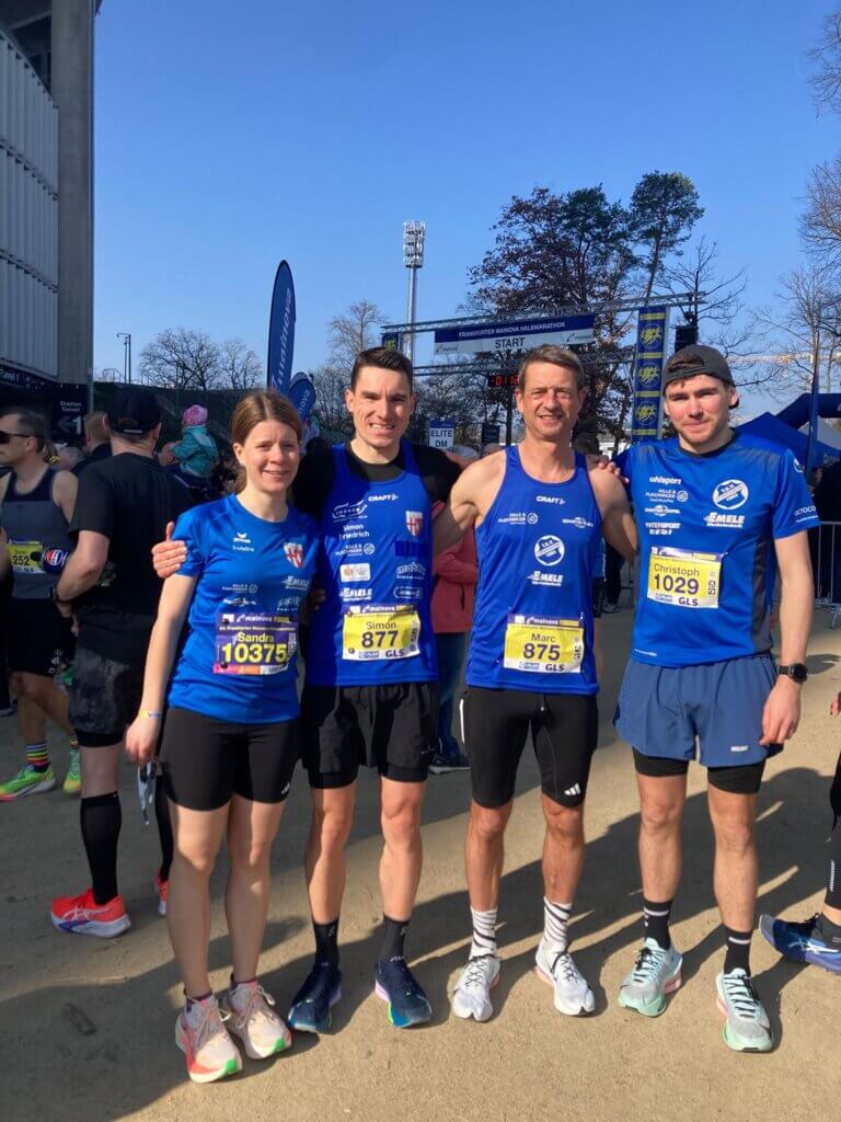 Am vergangenen Sonntag fanden die Deutschen Halbmarathonmeisterschaften im Rahmen des Frankfurter Mainova Halbmarathons statt, bei denen auch der TSV Straßberg stark vertreten war. Bei sonnigen, aber windigen Bedingungen lief Simon Friedrich nach 1:13:28 Stunden im Deutsche Bank Stadion über die Ziellinie. Damit belegte er in seiner Altersklasse M35 einen Platz im vorderen Drittel. Marc Meßmer überzeugte vor allem auf der ersten Rennhälfte und erreichte mit 1:17:02 Stunden einen hervorragenden fünften Platz in seiner Altersklasse M50. Auf den letzten vier Kilometern verlor er jedoch etwas Zeit – andernfalls wäre sogar ein Podestplatz möglich gewesen. Seine ersten Deutschen Meisterschaften bestritt Christoph Eberhard, das neueste Mitglied im Läuferteam. Er lief direkt eine persönliche Bestzeit von 1:18:23 Stunden. In der Mannschaftswertung belegte das Trio einen starken 46. Platz unter insgesamt 100 Teams. Auch Sandra Friedrich zeigte im Hauptlauf eine tolle Leistung: Sie überquerte nach 1:43:44 Stunden die Ziellinie und stellte damit ebenfalls eine persönliche Bestzeit auf.